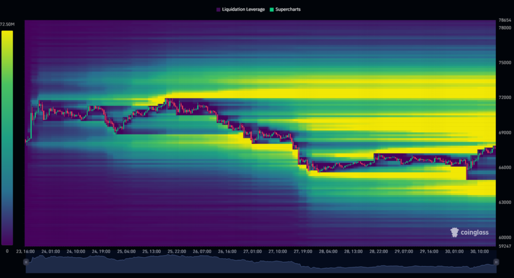 Vùng thanh khoản dày đặc quanh 64K – 65K trước đó đã bị hấp thụ gần như hoàn toàn. Các dải màu sáng ở khu vực này đã mờ đi đáng kể, trong khi thanh khoản phía trên quanh 69K – 72K vẫn còn tồn tại rất lớn.