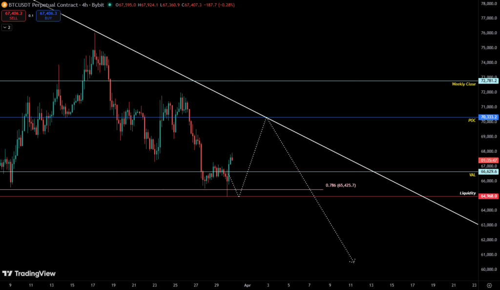 Nếu Bitcoin tiếp tục giữ được vùng giá hiện tại và duy trì đà hồi, khả năng cao thị trường sẽ hướng lên vùng thanh khoản tiếp theo quanh 70K.